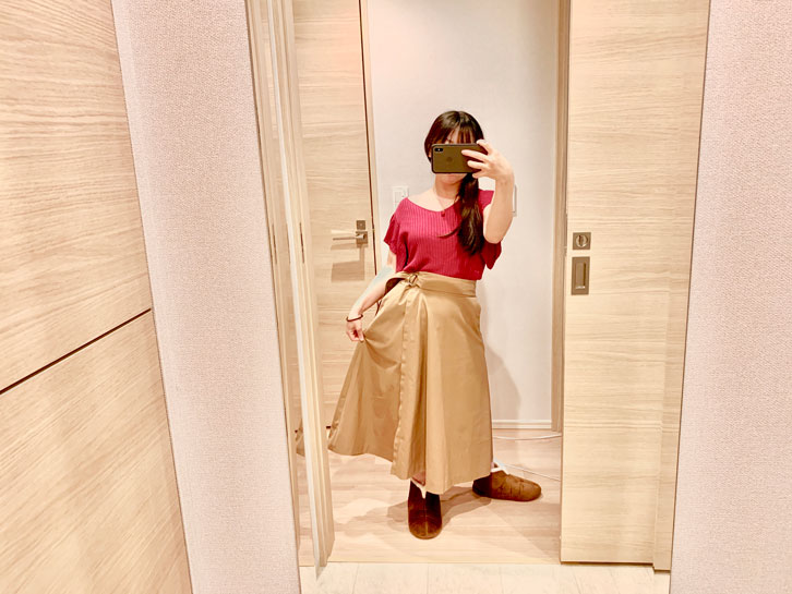 レストのミニスカートと合わせましたが、大振りのロングスカートをハイウエストで合わせたりサロペットなどと合わせてもいいかもしれません。