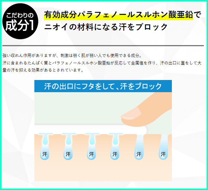 パラフェノールスルホン酸亜鉛で汗の出口に蓋をすることによって臭いの原因になる汗の量を抑える仕組みになっているようです。